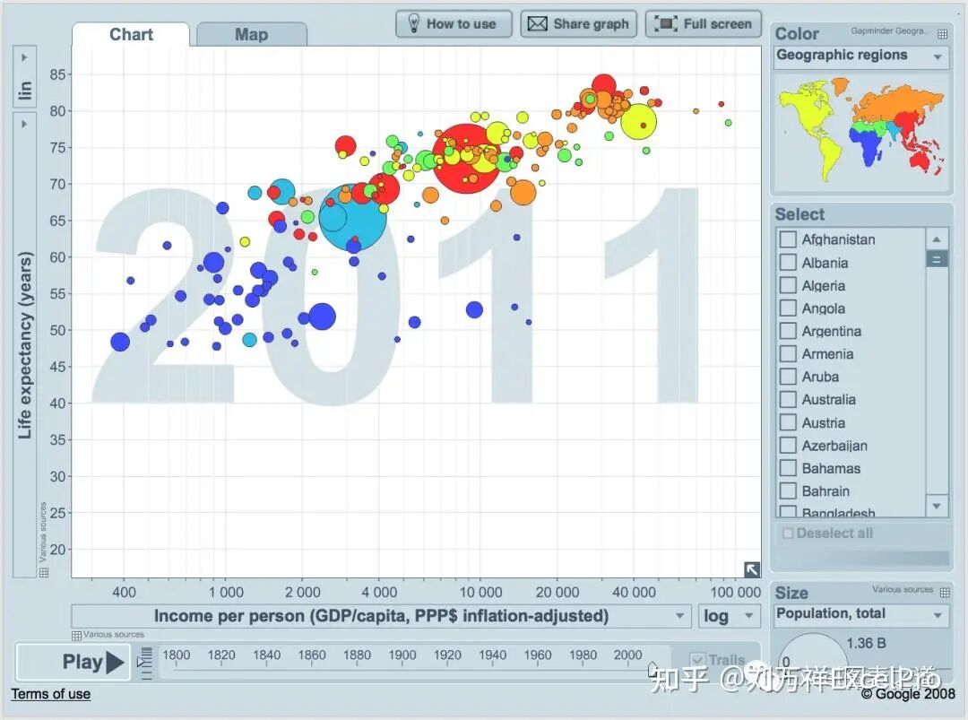 汉斯·罗斯林曾用几个动态的气泡图,讲完了世界两百年的健康与财富发展史,让无数人热泪盈眶。