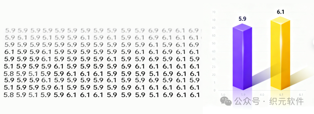 什么意思呢? 给你看一张写满 1000 个“5.9”和“6.1”的表格,你很难一眼找出哪个更大。但如果把它们变成一高一低的柱状图,你的大脑根本不需要思考,视神经会在几毫秒内告诉你答案。