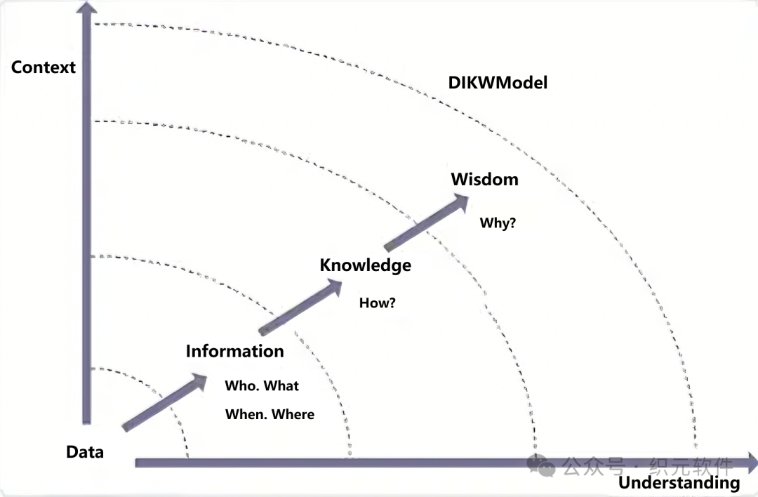在信息科学中,有一个著名的DIKW 模型:Data(数据) -> Information(信息) -> Knowledge(知识) -> Wisdom(智慧)。